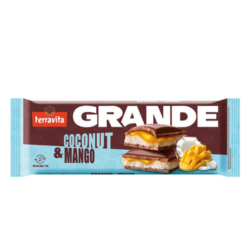 A tropical delight wrapped in smooth milk chocolate. This luxurious GRANDE bar features a double-layered filling of coconut and mango, blending creamy and fruity notes in every bite. The exotic pairing is both refreshing and indulgent, offering an escape to paradise through taste. Its generous size makes it perfect for sharing – or keeping all to yourself.