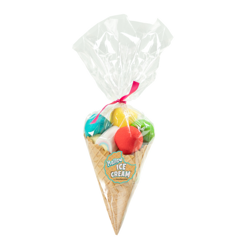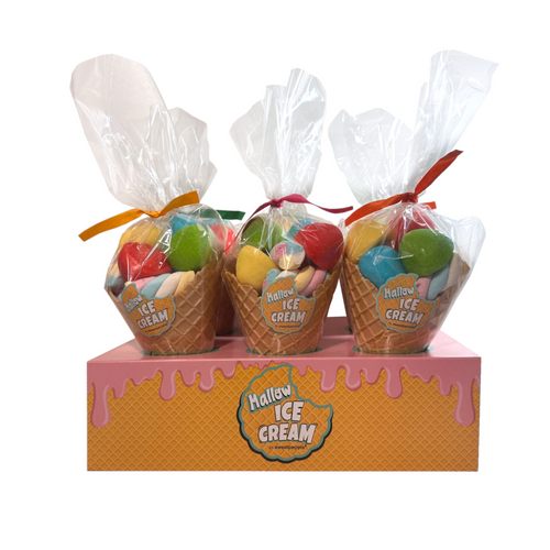 Marshmallow Ice Cream. The joy of an ice cream, without the chill.Fluffy marshmallow arranged in a wafer-style cone and tied with a ribbon. A whimsical, gift-ready treat perfect for party favours, gourmet hampers, children’s gifting and travel retail. Premium quality, Halal certified, and ambient shelf-stable.