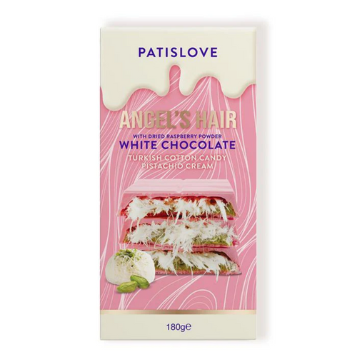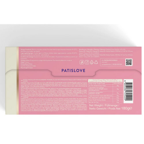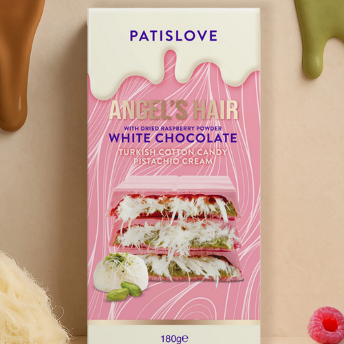 Inside, a rich 27% pistachio cream filling meets a soft, airy pişmaniye center, reminiscent of cotton candy. This combination brings both texture and depth—an indulgence that feels light yet satisfying, silky yet playful. Each bite unfolds in layers, offering a unique sensory experience where fruity notes mingle with nutty richness.