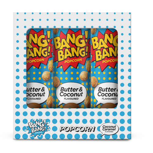 A tropical twist with indulgent sweetness. Bang Bang! Coconut Caramel Popcorn combines golden caramel richness with the natural sweetness of coconut, creating a unique flavour that excites and delights.