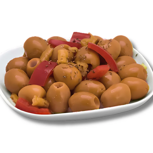 Pitted green gordal olive, water, salt, chilli cut, pepper red chopped, antioxidants (E-300 and E-330), preservatives (E-202 and E-211), flavour enhancers (E-621 and E- 635), anti-caking agent (E-551), acidulant (E-270), oregano and aromas authorized.