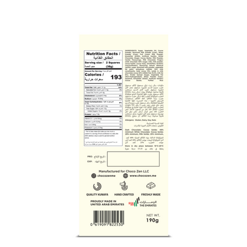 Choco Zen Dubai Chocolate Crispy Kunafa Buenissimo Milk Chocolate Bar 190g