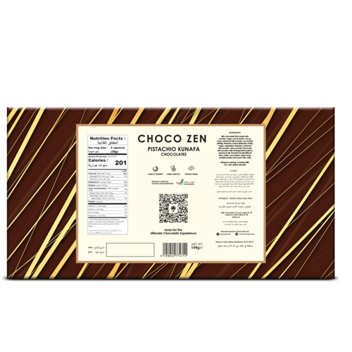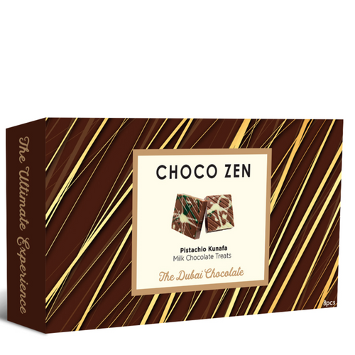 Choco Zen Pistachio Kunafa Milk Chocolate Treats is a luxurious chocolate bar that combines gourmet flavors with premium ingredients. Crafted with care, it offers a unique blend of taste and texture, making it a delightful treat for chocolate lovers.