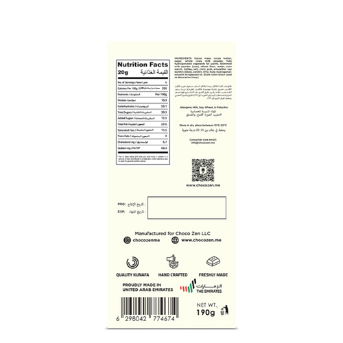 Choco Zen Dubai Chocolate Premium Coffee Kunafa Dark Chocolate Bar 190g