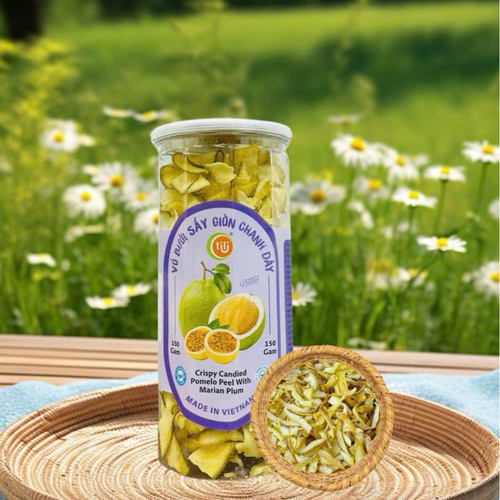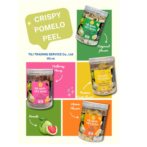 TILI Crispy Candied Pomelo Peel with Passion Fruit is a snack made from pomelo peel that is candied, dried until crisp, and flavored with passion fruit. The natural citrus taste of pomelo peel is balanced with the sweet-tart flavor of passion fruit, creating a snack that is light, crunchy, and easy to enjoy.