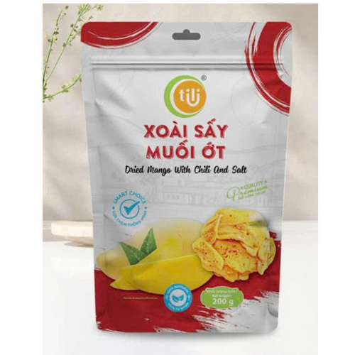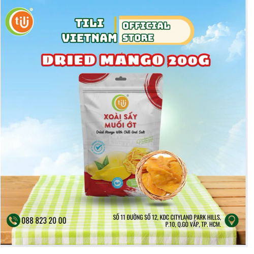TILI Dried Mango with Chili and Salt is a fruit snack made from ripe mango slices that are dried and lightly seasoned with chili powder and salt. The natural sweetness of mango is balanced with a mild heat and salty note, making it different from plain dried mango.