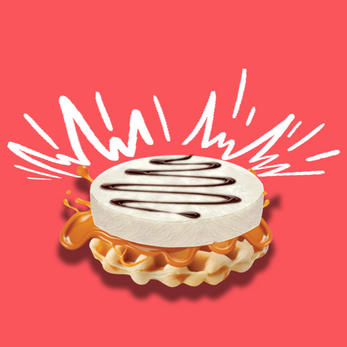 A freshly baked waffle topped with rich caramel sauce, smooth vanilla ice cream, and drizzled with decadent chocolate for the perfect indulgent treat.
