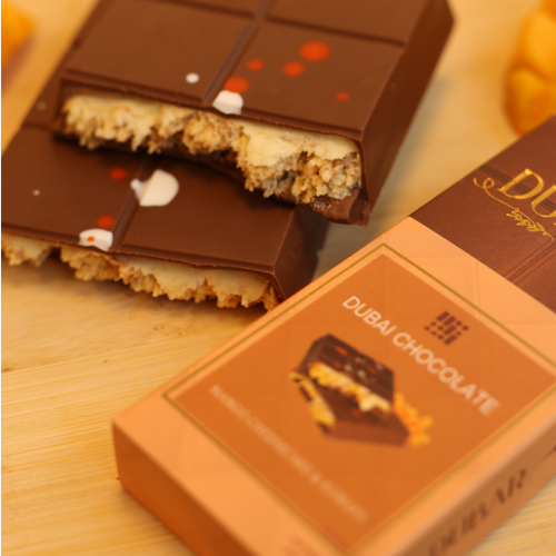 Dubar’s Mango Cheesecake & Kunafa Chocolate is a vibrant fusion of Flavors, where the luscious creaminess of cheesecake meets the sweet, tropical tang of ripe mango. Encased in smooth chocolate, the crispy kunafa layers add the perfect crunch, creating a delightful contrast of textures. Each bite is a refreshing yet indulgent experience, balancing rich, velvety sweetness with a hint of zesty brightness.