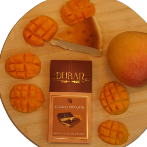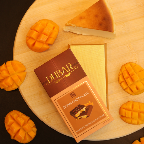 Dubar’s Mango Cheesecake & Kunafa Chocolate is a vibrant fusion of Flavors, where the luscious creaminess of cheesecake meets the sweet, tropical tang of ripe mango. Encased in smooth chocolate, the crispy kunafa layers add the perfect crunch, creating a delightful contrast of textures. Each bite is a refreshing yet indulgent experience, balancing rich, velvety sweetness with a hint of zesty brightness.