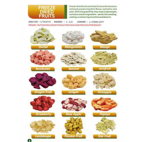 Freeze Dried fruits are fresh fruits with moisture removed, preserving their flavor, nutrients, and color. With a long shelf life, they make a lightweight, nutritious snack or ingredient—perfect for snacking, cooking, or enhancing smoothies and desserts.