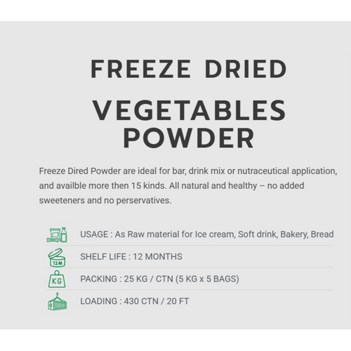 Freeze dried vegetable powder is perfect for enriching soups, sauces, smoothies, and baked goods with natural flavor and nutrients. It also works wonderfully in seasonings, dressings, dips, and as a convenient way to boost the nutritional value of any dish.
