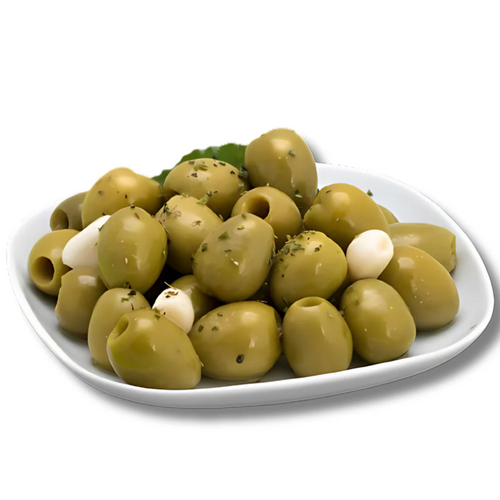 Pitted green gordal olives, water, olive oil extra virgin olive, white garlic, salt, antioxidants (E-300 and E-330), conservatives (E-202 and E-211), flavour enhancers (E-621 and E635), anti-caking agent (E-551), oregano, cumin, bay leaf and aromas authorized.