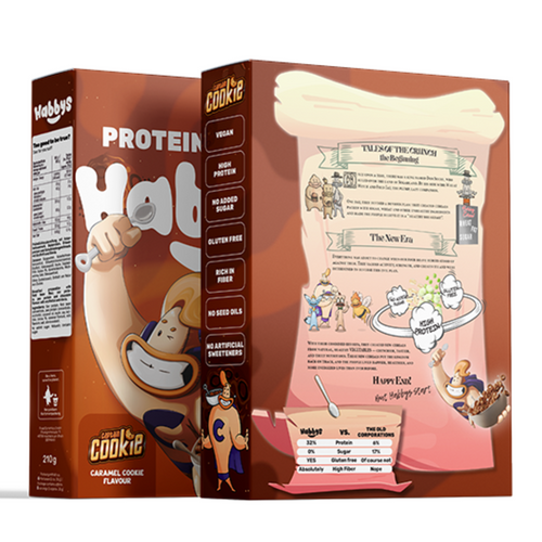 Crunchy, sweet and irresistibly tasty. Habbys bring back the childhood cereal experience you loved, but in a smarter, healthier way. With 32g of protein per 100g, no added sugar, and a unique mix of fava bean and milk protein, they deliver top nutritional value and amazing taste.