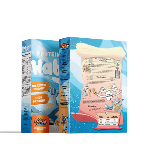Crunchy, sweet and irresistibly tasty. Habbys bring back the childhood cereal experience you loved, but in a smarter, healthier way. With 32g of protein per 100g, no added sugar, and a unique mix of fava bean and milk protein, they deliver top nutritional value and amazing taste.