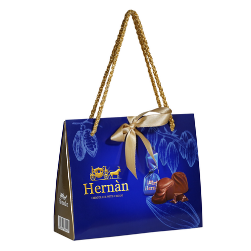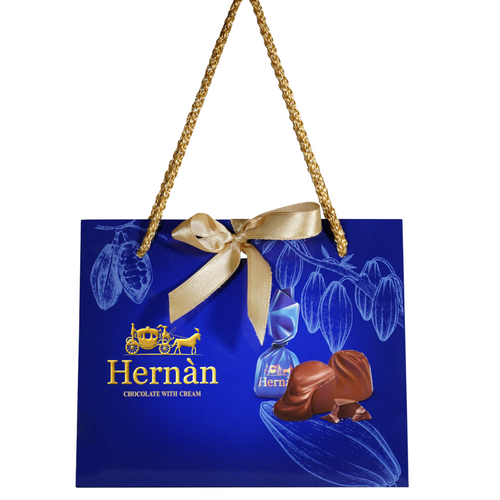 Pure chocolate with Hazelnut Flavour in Hernan Red Bag and Milk Chocolate Flovour in Hernan Blue Bag.