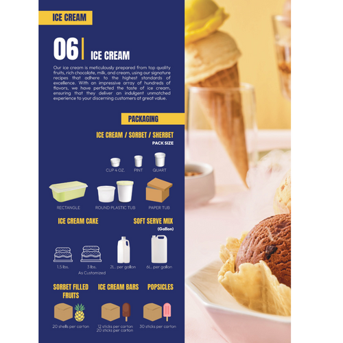 Our ice cream is meticulously prepared from top quality fruits, rich chocolate, milk, and cream, using our signature recipes that adhere to the highest standards of excellence. With an impressive array of hundreds of flavors, we have perfected the taste of ice cream, ensuring that they deliver an indulgent unmatched experience to your discerning customers at great value.