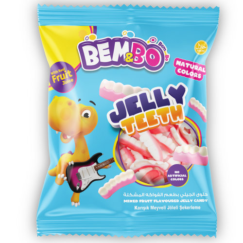 BEMBO Jelly Teeth are playful, mixed fruit-flavored jelly candies shaped like fun, chewy teeth, made with real fruit juice for a fruity burst in every bite. With natural colors, no artificial additives, and halal certification, this wacky and tasty treat is perfect for kids who love candy with a twist.