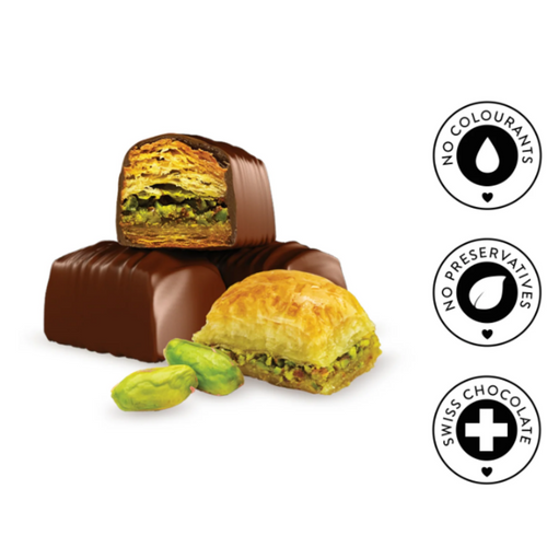 Juva Milk Chocolate Covered Pistachio Baklava (230g) reimagines a timeless classic with a contemporary touch. Layers of delicate baklava filled with premium pistachios are enveloped in smooth milk chocolate, creating an irresistible harmony of textures and flavors. The soft, nutty richness of pistachio pairs beautifully with the creamy sweetness of chocolate, delivering a dessert that is both familiar and refreshingly new. Perfect for indulgent moments or as a special gift, this treat blends tradition and creativity in every bite.