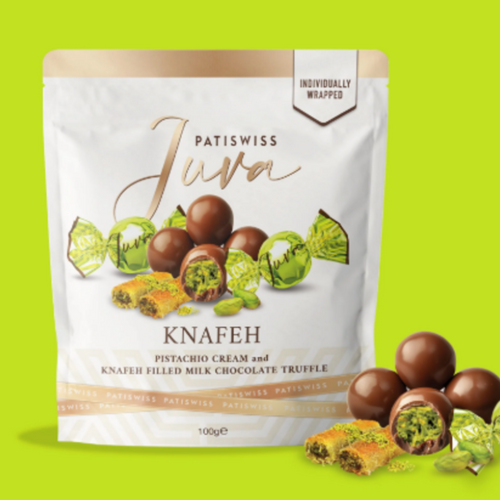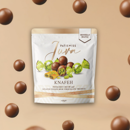Patiswiss Juva Knafeh is a refined fusion of Swiss chocolate artistry and the rich traditions of the Middle East. Each truffle combines smooth 60% milk chocolate with a luscious 35% pistachio cream and a delicate 5% kunefe filling. The result is a luxurious bite where the crisp texture of kunefe and the bold pistachio aroma meet the silky elegance of milk chocolate. Specially packaged to preserve freshness, these truffles deliver a taste experience that is both traditional and innovative.