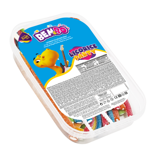 BEMBO Licorice Party is a fun and colorful mix of long licorice sticks filled with fruity flavor, perfect for sharing. Each 200g pack offers a tasty treat for kids and adults alike!