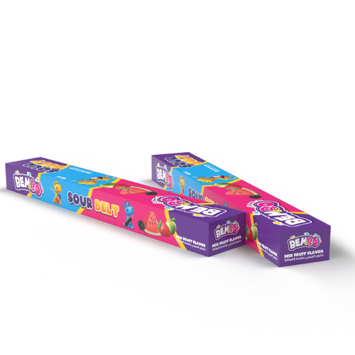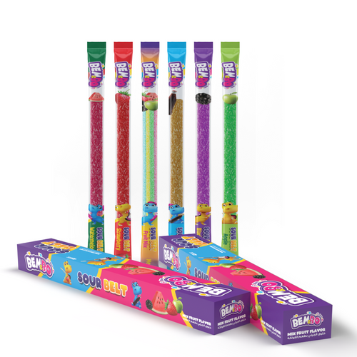 BEMBO Sour Belt deliver a playful punch of mixed fruit flavor in long, colorful strips bursting with sour goodness—available in fun varieties like watermelon, strawberry, apple, and more. Made with real fruit juice, natural colors, and wrapped in vibrant, kid-friendly packaging, these halal-certified treats are the perfect grab-and-go candy adventure for every little explorer.