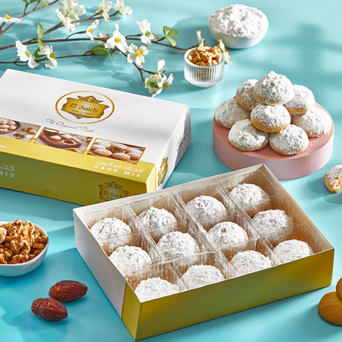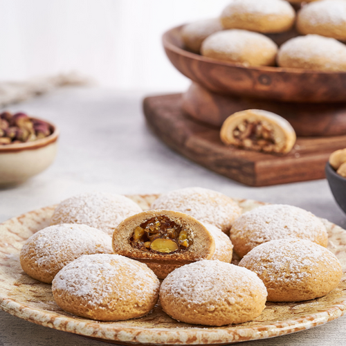 Assorted soft delicious kahk with different fillings like (Walnuts, Malban, Dates,Hazelnuts, Almonds & Hazelnuts Mix).