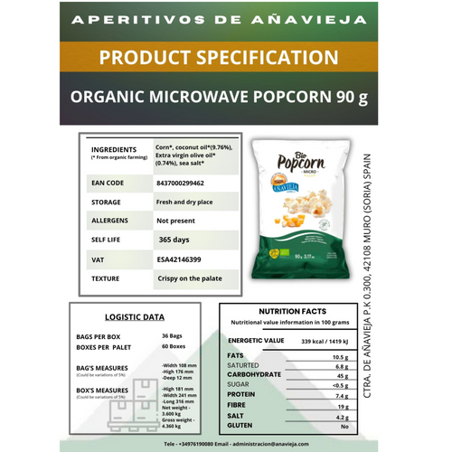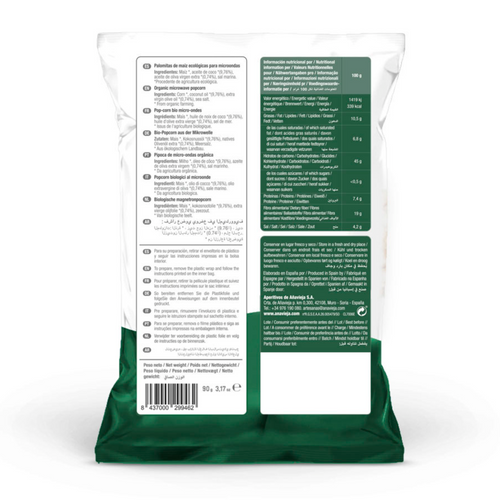 Organic microwave popcorn made with extra virgin olive oil for a rich, authentic taste. Naturally light, crisp, and ready in minutes — a clean-label snack with simple, organic ingredients.