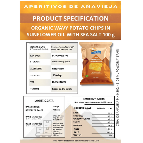 Organic riffled potato chips, cooked in high-quality sunflower oil and lightly seasoned with sea salt. Their wavy cut delivers extra crunch and holds more flavor in every bite — simple, natural, and delicious.