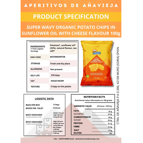 Organic super wavy potato chips with an intense, natural cheese flavor and extra crunch in every bite. Made with organic ingredients and cooked in sunflower oil, they’re a bold and satisfying snack for true cheese fans.