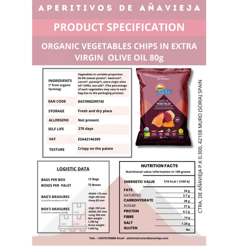 A crunchy and colorful mix of organic vegetable chips, lightly fried in extra virgin olive oil to preserve their natural taste. A gourmet snack made from simple ingredients — vibrant, wholesome, and irresistibly tasty.