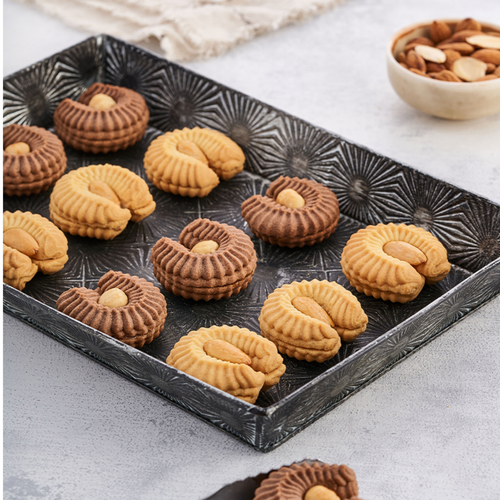 A box of assorted vanilla and chocolate petit four, made from the delicate Swiss petit four dough, enriched with natural butter, stuffed with jam and decorated with luxurious nuts.