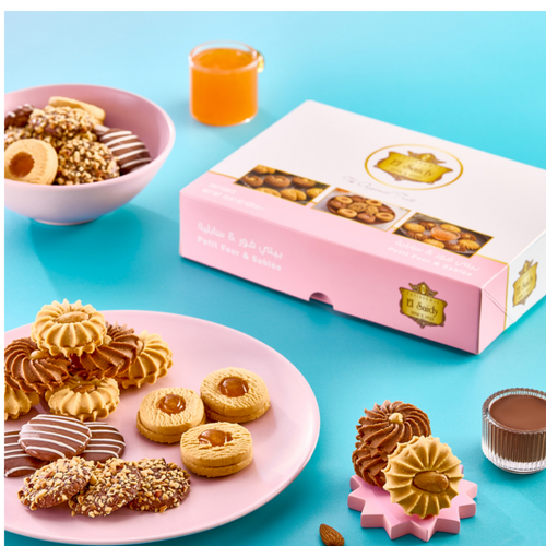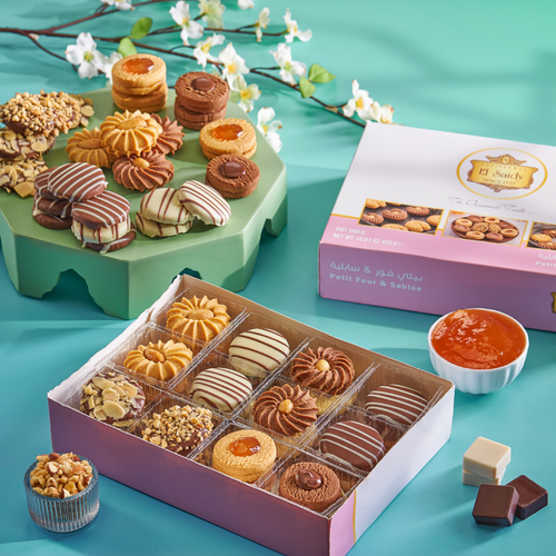 Assorted delicious mix of sablée and Vanilla & Chocolate Petit Fours, with Strawberry filling and premium nuts.