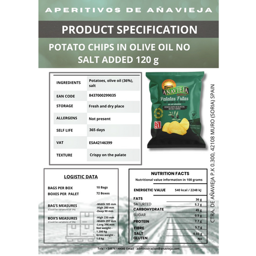 Potato chips cooked in premium olive oil with no added salt. Pure, simple, and full of natural flavor — just potatoes and olive oil for a clean, satisfying crunch.