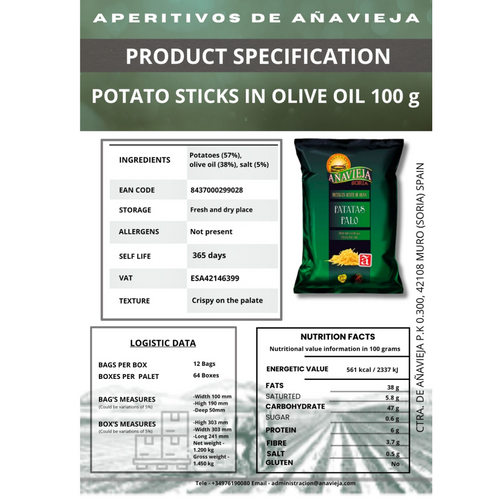 Potato sticks cooked in high-quality olive oil for a crisp texture and rich, authentic flavor. A simple, tasty snack made with just a few natural ingredients — perfectly golden and irresistibly crunchy.