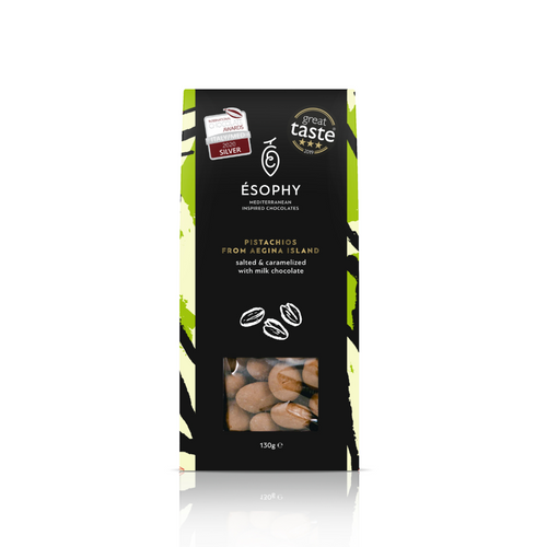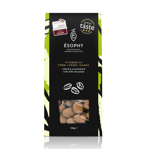 A delicious and prestigious treat. Pistachios from Aegina island, freshly roasted, salted and caramelized, coated in thin layers of rich milk chocolate.