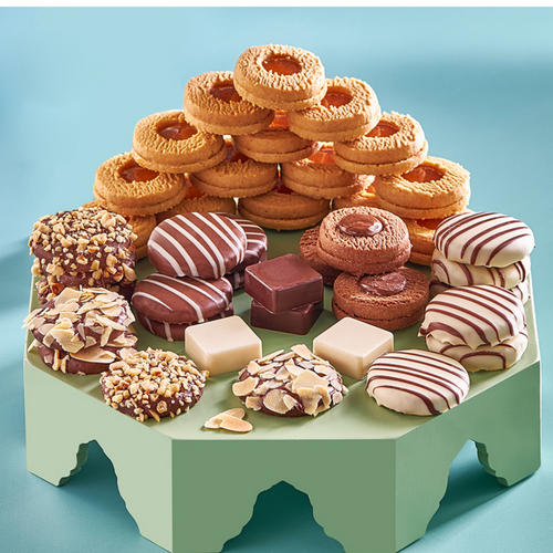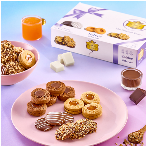 vanilla and chocolate sablés, made from French sablés dough enriched with natural butter and topped with a layer of natural dark chocolate and premium nuts.