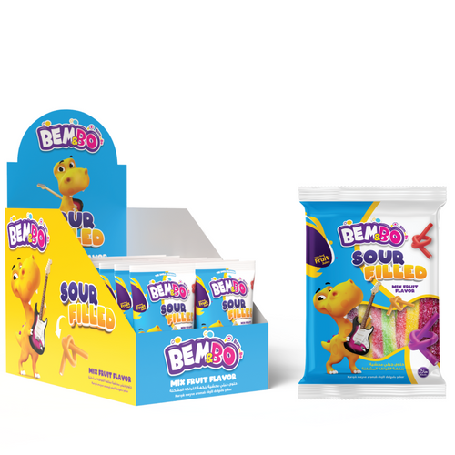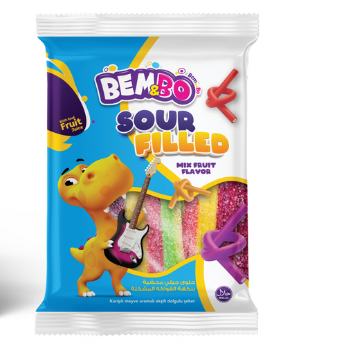 BEMBO Sour Filled is a tangy explosion of mixed fruit flavor with a surprise burst of sour filling inside every chewy strip, made with real fruit juice and no artificial colors. Packed in a vibrant, kid-friendly design featuring the fun-loving dino with a guitar, this halal-certified treat brings excitement to every bite and color to every shelf.