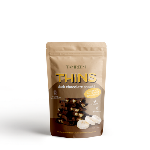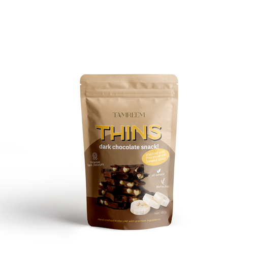 THINS Dark Chocolate stacked with Freeze-Dried Banana Slices