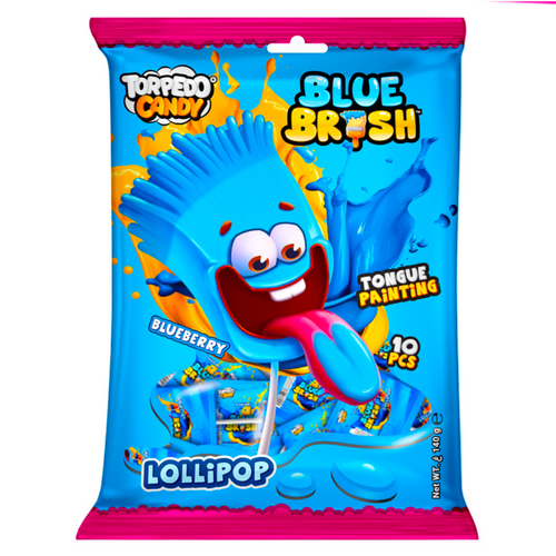 Get ready for an explosion of flavor with the Torpedo Candy Blue Brush Lollipop! This isn't just a treat, it's an experience. Each lick delivers a delicious burst of blueberry flavor while the unique "brush" shape paints your tongue a vibrant blue. It's the perfect mix of a sweet, tasty lollipop and a fun, creative way to enjoy your candy.