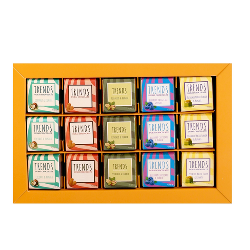 Experience a delightful twist on tradition with 30 bite-sized chocolate with kunafa creations, each infused with rich, contemporary flavors. This tempting box features five standout varieties. Each perfectly layered with crisp kunafa and creamy fillings. Whether you're hosting, gifting, or indulging solo, this collection offers a unique taste journey in every bite.