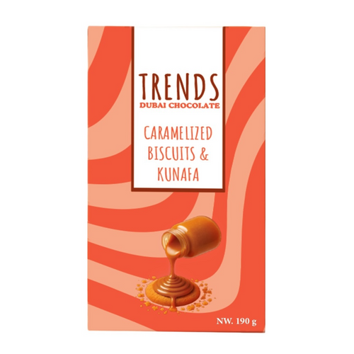 Trends’ Caramelized Biscuits and Kunafa Chocolate is a unique fusion of two beloved Flavors. The smooth, rich chocolate is combined with the caramelized crunch of Lotus Biscoffand the delicate, golden strands of kunafa. With every bite, you’ll experience the perfect harmony of sweet, creamy, and crispy textures, creating a luxurious treat that bridges tradition and innovation. Indulge in this exquisite chocolate and Savorthe essence of Middle Eastern indulgence like neverbefore.