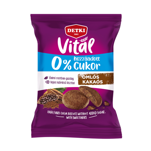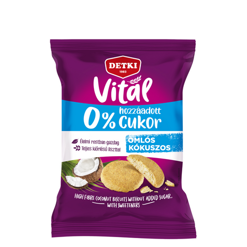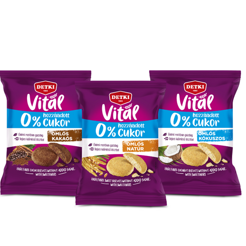 Heavenly sweet taste, with no added sugar. We recommend this updated version of our Édes biscuits to all sugar avoiders and those following a lower calorie diet. Detki Vital crisp biscuits are available in three flavours, made with wholemeal flour, with no added sugar, meaning they fit perfectly into a varied, balanced diet. Try it in natural, coconut and cocoa flavours.